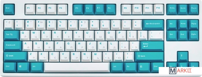 КЛАВИАТУРА БЕЗ КИРИЛЛИЦЫТип: тактильныйСила нажатия: 55 грамм (средние)Длина пути: 4 мм (2 мм до срабатывания)Данная модель выполнена в белом цвете с мятно-голубыми клавишами-модификаторами — расцветка получилась очень свежей и приятной. Клавиатура собрана добротно и монолитно, а сочетание высококачественных double-shot PBT клавиш с переключателями Cherry MX и звукопоглощающей подложки позволяет сделать печать на клавиатуре максимально тихой (насколько это возможно для механики). Mini-USB порт спрятан в центре под корпусом, а на самой клавиатуре имеются центральная и две боковые канавки под кабель.Клавиатура поддерживает сочетание клавиш для регулировки громкости и управления музыкой, также имеется возможность переключения между 6KRO и NKRO.DIP-переключатели на задней панелиДают возможность поменять местами функции кнопок Ctrl и Caps Lock, Windows и Alt, Windows и Fn или отключить Windows.Звукопоглощающая подложкаПоглощает звуки при нажатии, делая процесс печати более тихим по сравнению с обычными механическими клавиатурами.Низкопрофильные клавиши Step-Sculpture2Данные клавиши заметно ниже и имеют оптимальный угол наклона, из-за чего, по отзывам, печатать приятнее и комфортнее, чем на более высоких клавишах.Клавиатура совместима с Mac OSFN-слой работает (кроме клавиш F6, F8, F9), а поменять местами клавиши-модификаторы можно в системных настройках. Проверено с MAC OS 10.13Функция Full N-key Rollover по USB (NKRO)Позволяет нажимать одновременно неограниченное количество клавиш. Для печати идеально подойдет как 6KRO, так и NKRO, независимо от вашей скорости. Для игр NKRO будет плюсом и неважно, нажимаете ли вы больше 6 кнопок или нет, поскольку, играя в любую игру, вы можете случайно нажать пару лишних клавиш и из-за этого клавиатура имеет шанс не среагировать на нажатие, которое вы хотели совершить изначально. Имеется возможность переключения между NKRO и 6KRO через FN сочетания.
